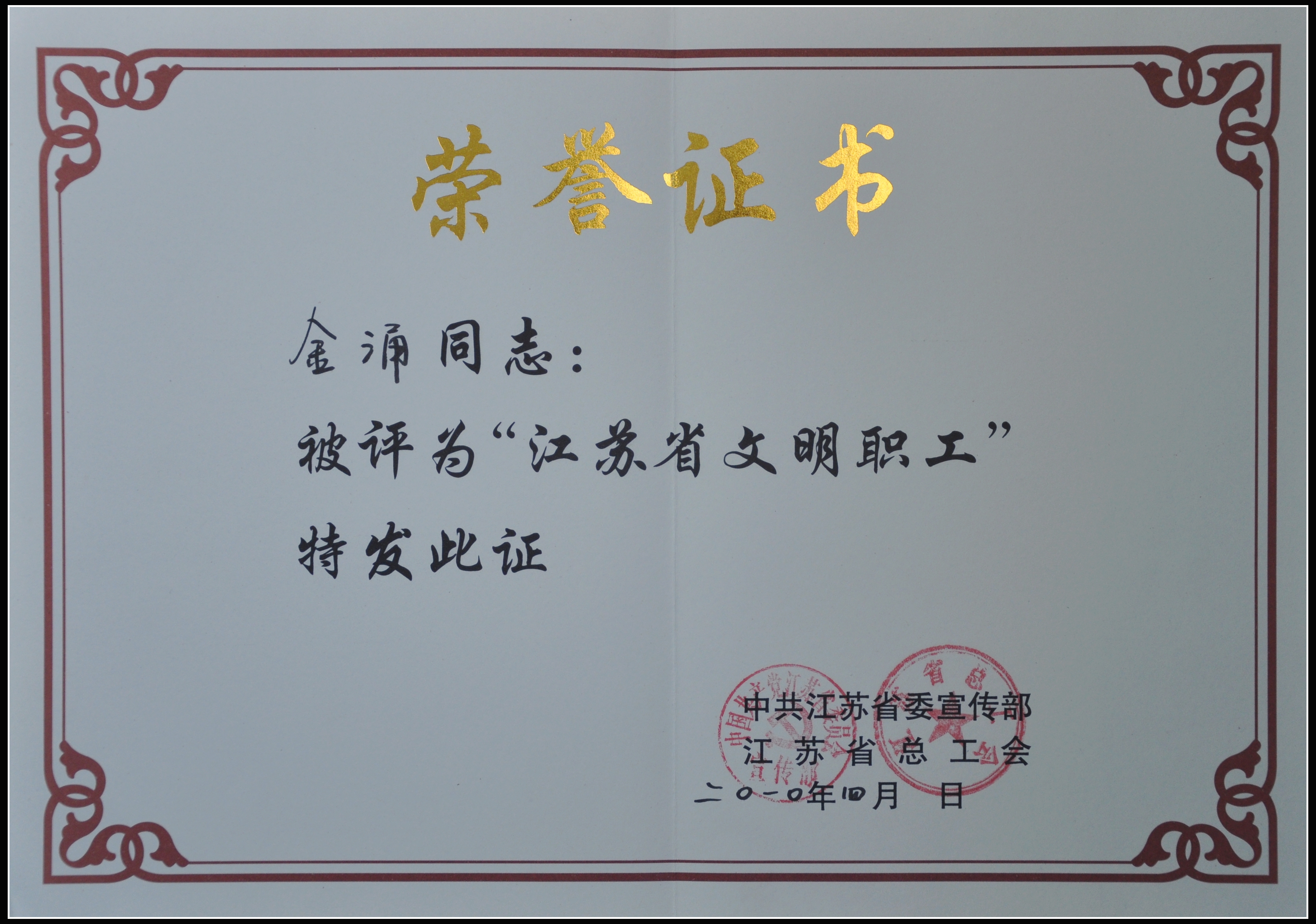 > 金涌榮獲“江蘇省文明職工”稱(chēng)號(hào)