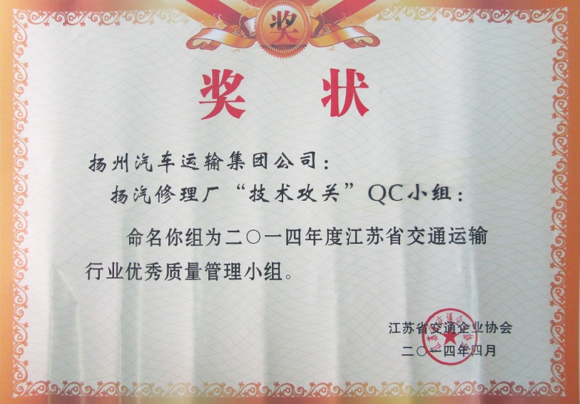 又訊:在此前進行的江蘇省交通運輸行業(yè)優(yōu)秀QC小組成果評選中,集團公司被表彰為“省交通運輸行業(yè)質(zhì)量管理小組活動優(yōu)秀企業(yè)”,揚州汽車站“驛站快件”QC小組(成果《降低到達庫收發(fā)貨的誤差率》)與修理廠“技術(shù)攻關(guān)”QC小組(成果《汽車變速箱小車式托架的研制》)被評為“省交通運輸行業(yè)優(yōu)秀質(zhì)量管理小組”。