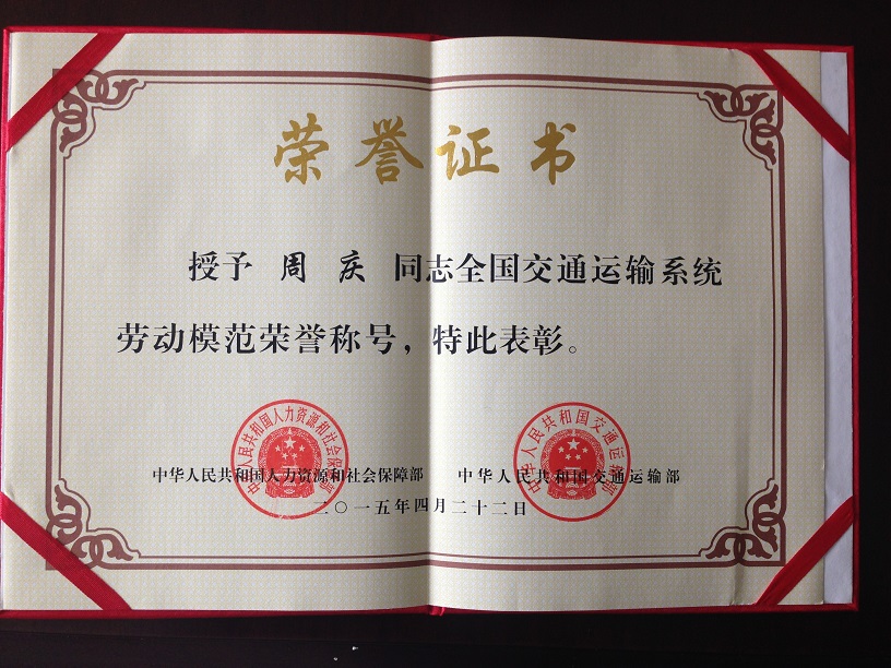 駕駛員周慶榮獲“全國(guó)交通運(yùn)輸系統(tǒng)勞動(dòng)模范”稱號(hào)