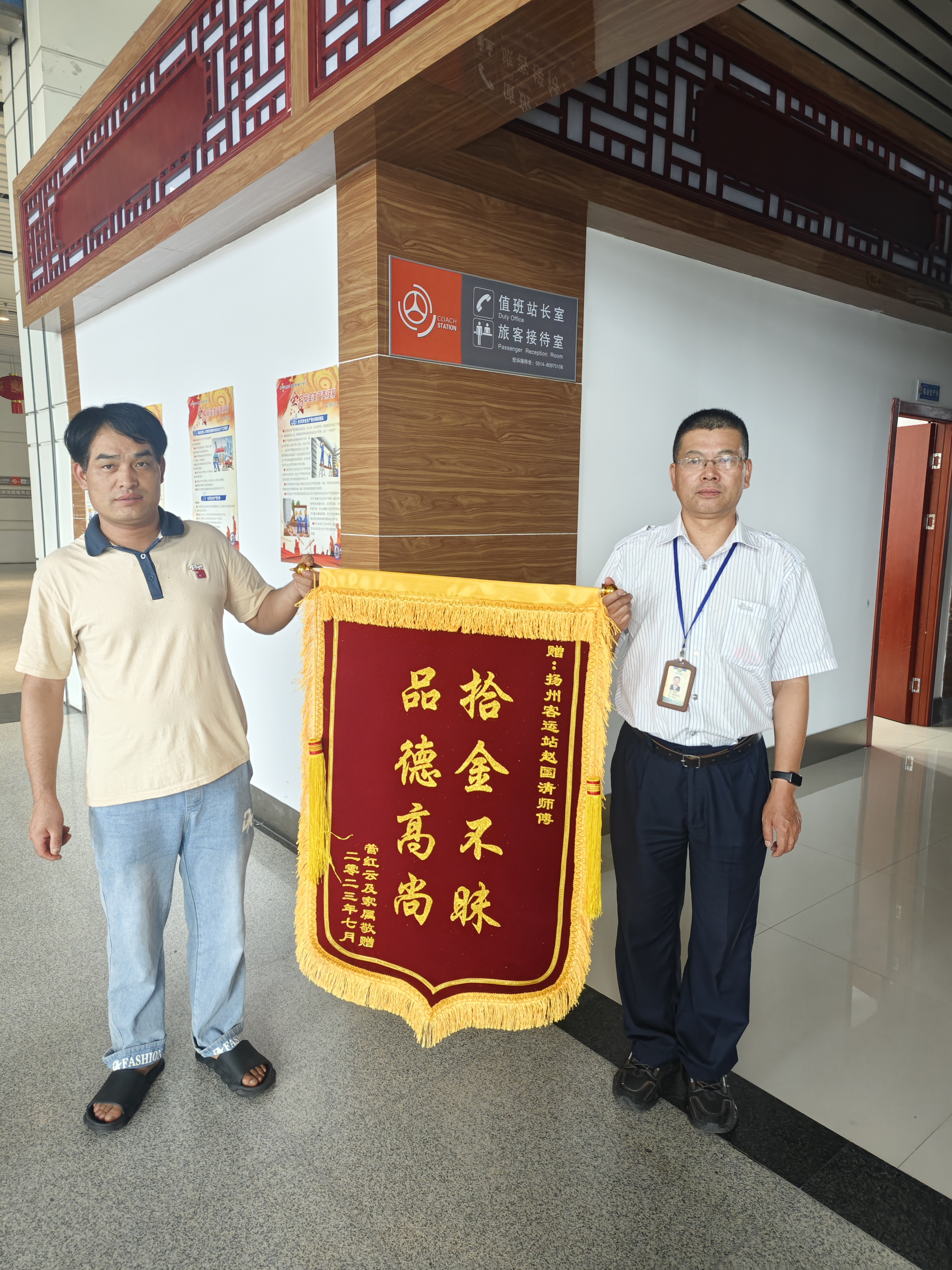 7月18日,失主管先生專門制作了一面“拾金不昧,品德高尚”的錦旗到揚(yáng)州汽車站值班室對好人趙國清表示感謝。接下來,揚(yáng)汽集團(tuán)站務(wù)中心將繼續(xù)以黨建為引領(lǐng),以榜樣為鏡,向榜樣看齊,充分發(fā)揮先鋒模范帶頭作用,深入推動“星級服務(wù),溫馨之旅”黨建微品牌工作走深走實。